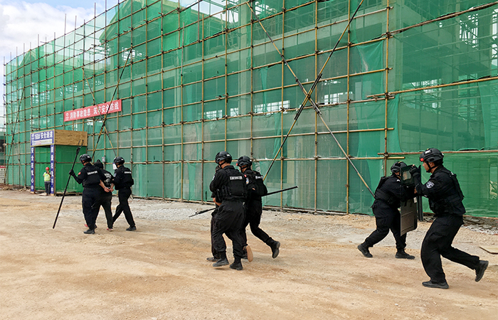 演練現(xiàn)場嚴(yán)格按預(yù)案展開救援,前三個場景分別是現(xiàn)場工人發(fā)生火災(zāi)、觸電、高處墜落并受傷等施工現(xiàn)場常見的安全事故情況下,由指揮啟動應(yīng)急預(yù)案,現(xiàn)場各應(yīng)急小組嚴(yán)格按照應(yīng)急預(yù)案進行處理,配合119消防人員、120急救人員完成搶險消除事故、妥善處置傷員。最后一項反恐應(yīng)急演練,其場景是在當(dāng)前反恐形勢日益嚴(yán)峻的形勢下,3名暴恐分子偽裝成農(nóng)民工隱藏在施工工地妄想伺機作案,由于不配合項目部員工進行農(nóng)民工實名制登記而暴露身份,3名暴恐分子拔出攜帶的道具砍向項目部員工,項目部員工立即與其展開周旋并掩護一名員工向指揮匯報情況,請求救援。因3名暴恐分子攜帶刀具砍傷人員,接到報告后現(xiàn)場立即啟動反恐預(yù)案,各小組展開救援,保衛(wèi)組持長棍對暴恐分子圍堵并保持距離,醫(yī)療組對受傷人員即刻開展緊急救治,通訊組立刻撥打110請求警務(wù)人員支援,撥打120請求急救中心急救傷員。警務(wù)人員到來后制服兇徒,傷員得到120人員急救處理,現(xiàn)場隱患得到消除。