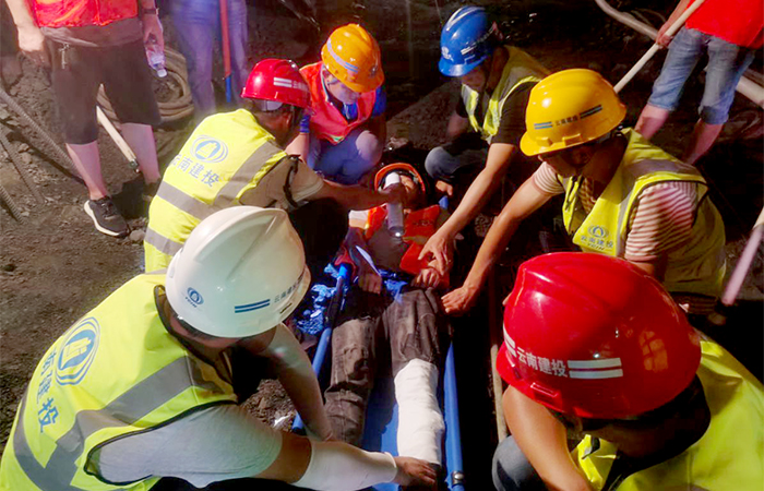 演練活動前,項目部制定了詳細的《隧道坍塌應急救援演練方案》。演練根據(jù)模擬場景方案有序進行:楊家灣隧道由于地質(zhì)缺陷導致工作面隧道坍塌,在現(xiàn)場管理人員的指揮下,4名工人快速安全撤出隧洞,但其中1名工人在撤離過程中被石塊砸中未能安全撤出。事故發(fā)生后,項目部立即啟動突發(fā)事故應急救援預案實施救援。應急救援指揮部的各小組按照分工有條不紊地完成了傷員救治、物資搶險、事故調(diào)查等應急救援流程,整個演練過程緊張、有序、實操性強。