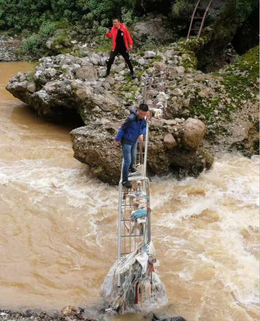 前進路上地勢極其復(fù)雜多變,崎嶇的山路,茂密的叢林,山嶺重疊交錯,蜿蜒盤旋,猶如一條正在酣睡的巨龍,腳下松軟的泥土像擁有靈魂的沼澤,不斷拖慢隊伍前行的速度。湍急的河流不斷奔涌,只有一個簡陋的橫梯橫在中央,但是,如此復(fù)雜的路徑最終還是被隊伍赤誠的責(zé)任心和兄弟間互幫互助的團結(jié)情所擊退。