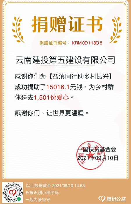 • 9月10日下午2點(diǎn),一張捐贈證書新鮮出爐。公司787名黨員、干部、職工及家屬,僅用一天時間,為“益滇同行助力鄉(xiāng)村振興”活動籌集善款共計15016.1元,在云南建投集團(tuán)募捐榜位列第二。