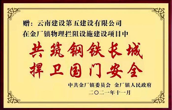 “共筑鋼鐵長(zhǎng)城 捍衛(wèi)國(guó)門安全”,金廠鎮(zhèn)對(duì)公司在金廠鎮(zhèn)物理阻攔設(shè)施項(xiàng)目建設(shè)中同心同向、共克時(shí)艱、迎難而上的付出表示誠(chéng)摯感謝。