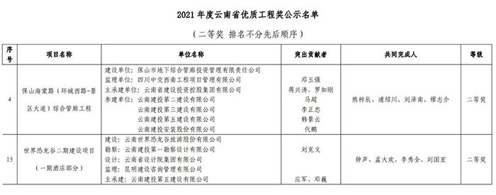 • 近日,云南省建筑業(yè)協(xié)會(huì)公布了2021年度云南省優(yōu)質(zhì)工程獲獎(jiǎng)名單,公司承建的保山海棠路(環(huán)城西路-景區(qū)大道)綜合管廊工程、世界恐龍谷期建設(shè)項(xiàng)目(一期酒店部分)2個(gè)項(xiàng)目榮獲二等獎(jiǎng)。