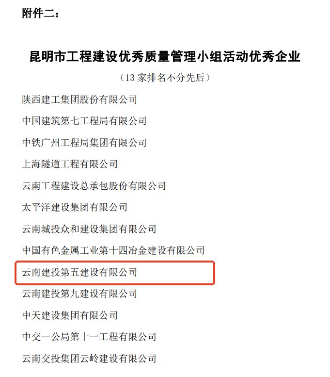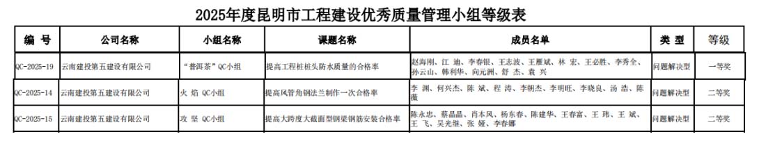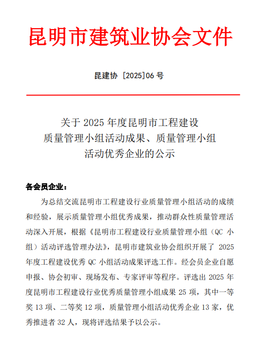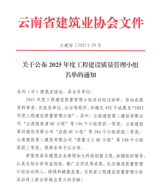 • 近日,云南省建筑業(yè)協(xié)會(huì)、昆明市建筑業(yè)協(xié)會(huì)相繼公布2025年度工程建設(shè)優(yōu)秀質(zhì)量管理小組成果評(píng)選結(jié)果,公司共8項(xiàng)優(yōu)秀QC成果獲獎(jiǎng),其中云南省建筑業(yè)協(xié)會(huì)一等獎(jiǎng)2項(xiàng),二等獎(jiǎng)1項(xiàng),三等獎(jiǎng)2項(xiàng);昆明市建筑業(yè)協(xié)會(huì)一等獎(jiǎng)1項(xiàng),二等獎(jiǎng)2項(xiàng)。公司獲評(píng)昆明市建筑業(yè)協(xié)會(huì)“工程建設(shè)優(yōu)秀質(zhì)量管理小組活動(dòng)優(yōu)秀企業(yè)”稱(chēng)號(hào)。