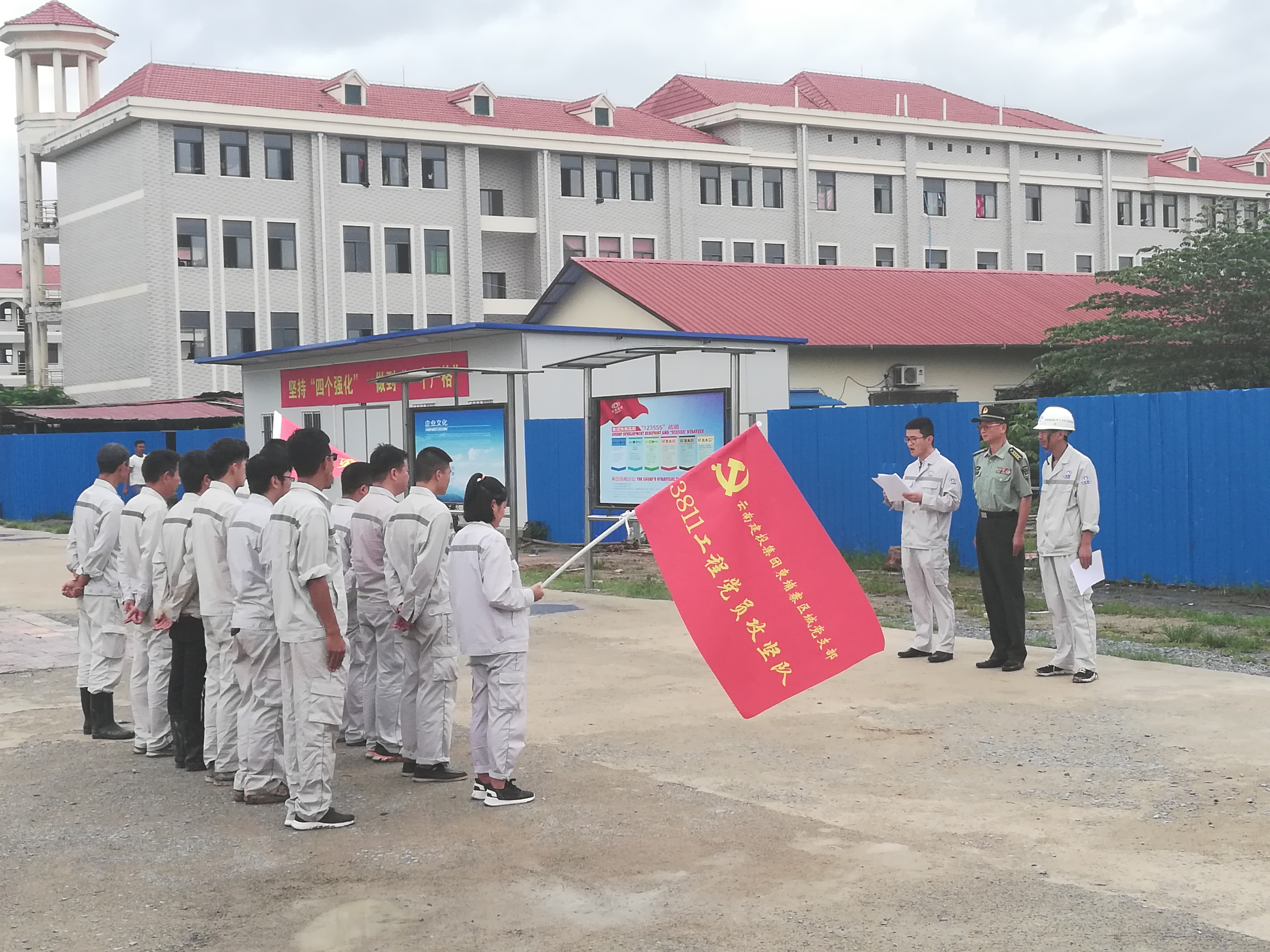 • 7月21日上午,柬埔寨3811工程成立“黨員攻堅隊”。援柬專家組成員魏傳庭、董軍,專家組組長鮑廣慶,國際工程部副總經(jīng)理楊俊參與授旗儀式。鮑廣慶、楊俊共同授旗,區(qū)域黨支部“黨員攻堅隊”隊長王雄、3811項目“黨員攻堅隊”副隊長畢良春接旗。