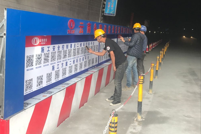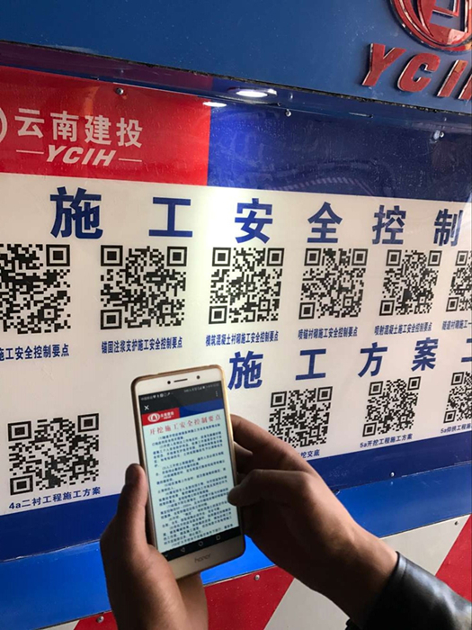 二維碼掃描平臺位于古那灣2號隧道進(jìn)口端洞外的休息區(qū)及洞口人車分流區(qū)的人行道上,涵蓋施工安全控制要點、施工方案、作業(yè)指導(dǎo)書、安全技術(shù)交底、安全操作規(guī)程等施工工藝、規(guī)范和安全、技術(shù)、質(zhì)量管理內(nèi)容。進(jìn)入施工現(xiàn)場前如需查詢相關(guān)資料,可直接通過手機(jī)掃描二維碼進(jìn)行查詢,操作非常方便。就算施工員不小心忘記了施工技術(shù)交底中的某個數(shù)據(jù),只要輕松掃一掃就能全部“收入囊中”,巧當(dāng)施工現(xiàn)場的“教科書”。