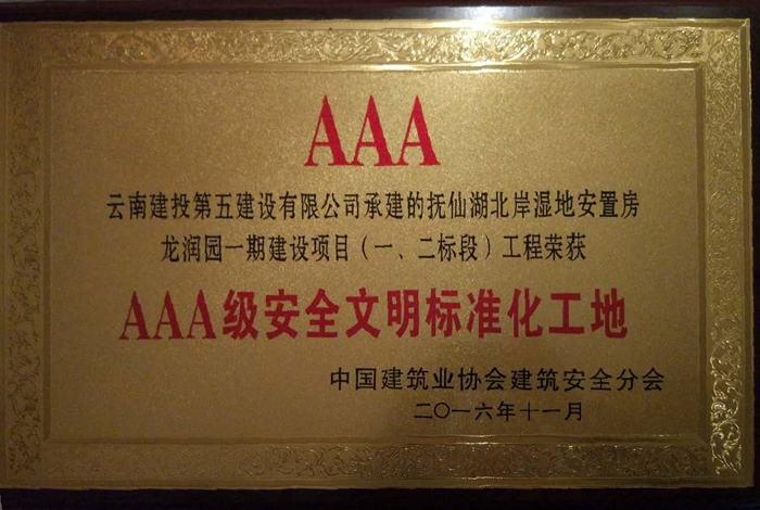 技術(shù)支持: 方森科技 11月29日,2016年中國建筑業(yè)協(xié)會建筑安全分會年會暨理事會在安徽合肥舉行,由第三直管項目部施工的撫仙湖北岸濕地安置房龍潤園一期建設(shè)項目(一、二標(biāo)段)獲2016年“AAA級安全文明標(biāo)準(zhǔn)化工地”稱號。