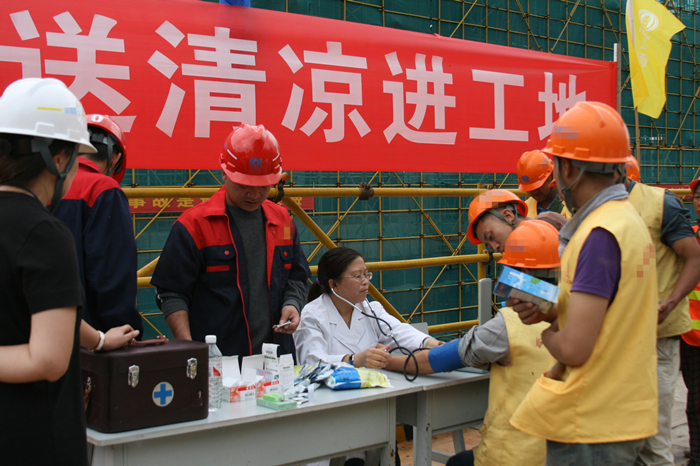 公司結(jié)合禁毒宣傳活動(dòng)同時(shí)開(kāi)展送清涼活動(dòng),退管會(huì)劉秀偉醫(yī)生免費(fèi)為現(xiàn)場(chǎng)職工進(jìn)行心臟、脈搏、血壓等常規(guī)體檢,開(kāi)展了防流感咨詢,宣傳了高血壓、高血脂、糖尿病等常見(jiàn)慢性疾病的預(yù)防保健知識(shí)。公司工會(huì)、五〇八直管項(xiàng)目部、五〇四直管項(xiàng)目部、第三安裝直管項(xiàng)目部一同為項(xiàng)目管理一線管理人員和勞務(wù)班組人員發(fā)放小風(fēng)扇、清涼茶、藿香正氣水、板藍(lán)根、風(fēng)油精、清涼油、保濟(jì)丸等十幾種預(yù)防夏季高溫中暑的藥物。還發(fā)放了創(chuàng)可貼、醫(yī)用酒精、棉球等日常外用藥品和200盒計(jì)生用品。