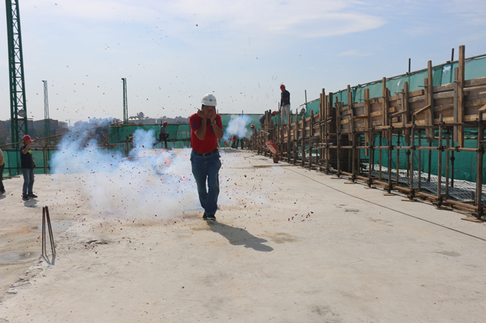 封頂儀式上云南體育運動職業(yè)技術(shù)學(xué)院院長李錫云及書記陳麟在結(jié)構(gòu)屋面層點燃了鞭炮以祝賀綜合訓(xùn)練館1軸-10軸/L軸屋面斜梁完成了最后一方混凝土的澆筑,這也預(yù)示著項目正式轉(zhuǎn)入二次結(jié)構(gòu)及裝飾裝修施工階段。