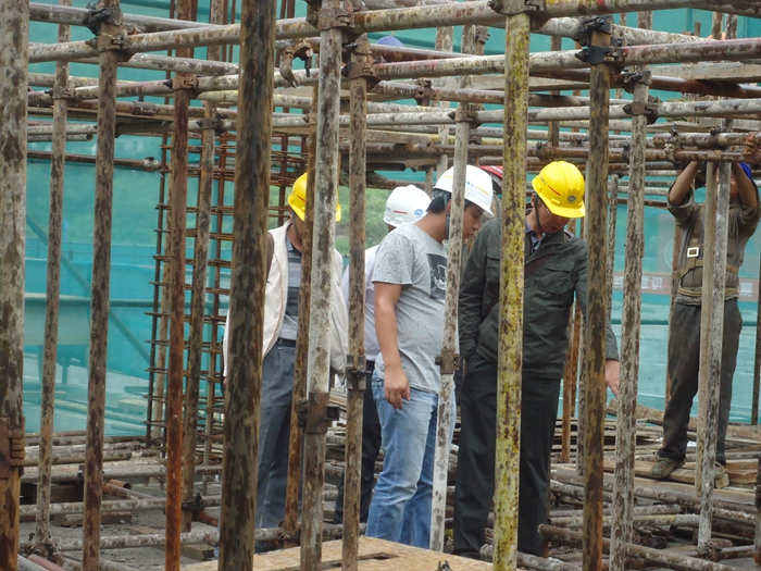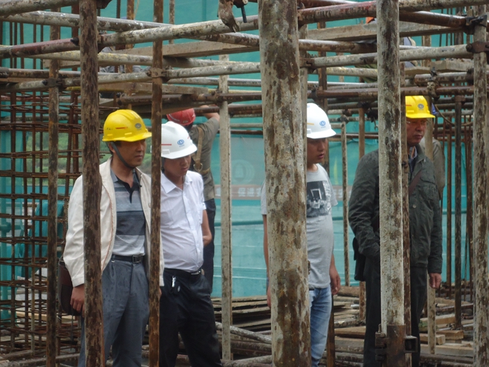 焦倫杰一行首先對生化膜池進(jìn)行實地觀查,詳細(xì)了解膜池及設(shè)備區(qū)高支模的相關(guān)技術(shù)和操作細(xì)節(jié)后,指出施工現(xiàn)場存在的安全問題,并要求項目部及時進(jìn)行整改,針對雨季施工面臨的問題給出了解決的意見和建議。
