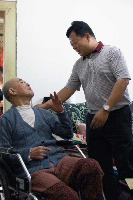 “別起來(lái),別起來(lái),您躺著就行了。”一到退休職工黃瑞泉老人家里時(shí),老人便迫不及待地想要起身迎接,李興奎趕緊到臥室去幫忙攙扶。黃瑞泉患有腦梗且偏癱多年,生活不能自理,在其老伴的幫助下坐上輪椅來(lái)到了客廳。李興奎仔細(xì)詢問(wèn)了黃瑞泉的身體狀況和其子女的相關(guān)情況,并向黃瑞泉老人送上了節(jié)日慰問(wèn)金,“這是公司的一點(diǎn)心意,預(yù)祝你們節(jié)日愉快!你要好好休息,保重身體,有什么困難就向退管會(huì)反映,我們一定會(huì)盡力幫助解決?!?71歲的黃瑞泉顫顫巍巍地拉著李興奎的手不斷地道謝:“謝謝你們!謝謝書(shū)記!”