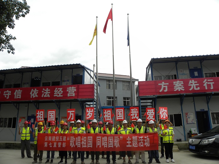 活動先后在直管部、蘭坪縣營盤鎮(zhèn)易遷項目、蘭福公路項目、嶍峨古鎮(zhèn)項目分別進行。在項目部以開展集中升旗儀式,合唱、同唱國歌,快閃等方式,以義勇軍進行曲》《建投之歌》《我和我的祖國》為主唱曲目唱響愛國歌曲。