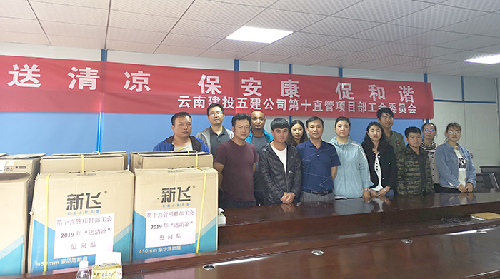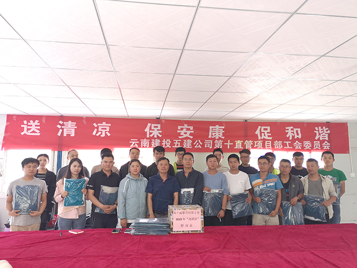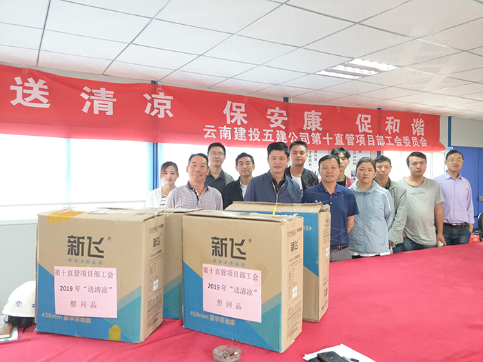 • 正值高溫時(shí)節(jié),氣溫日益炎熱,結(jié)合公司2019年“送清涼 保安康 促和諧”活動主題,5月7日-13日期間,第十直管部工會深入施工一線,慰問長期奮戰(zhàn)在施工一線的職工,為他們送去了站立式旋轉(zhuǎn)電風(fēng)扇和防曬服,給高溫酷暑的一線帶來些許涼意。