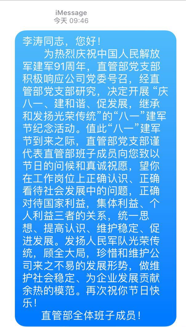 8月1日,第四直管項目部黨支部積極響應公司黨委號召,在直管部開展主題為“慶八一、建和諧、促發(fā)展,繼承和發(fā)揚光榮傳統(tǒng)”的“八一”建軍節(jié)紀念活動。 在“八一”建軍節(jié)到來之際,直管部黨支部書記陳德正代表黨支部和直管部領(lǐng)導班子向兩名復退轉(zhuǎn)崗軍人發(fā)送了慰問短信,并以電話的方式再次向他們表達節(jié)日的祝福和問候。望他們在工作崗位上正確認識、正確看待社會發(fā)展中的問題,正確對待國家利...