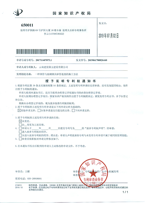 • 近日,公司《一種鋼管與水泥預(yù)制管連接的施工方法》與《一種鋼管與玻璃鋼夾砂管連接的施工方法》兩項(xiàng)技術(shù)成果榮獲國(guó)家發(fā)明專利授權(quán)。 兩個(gè)發(fā)明專利由路橋二部在公司技術(shù)中心等相關(guān)部門的指導(dǎo)下完成,項(xiàng)目部依托昆明市第十四污水處理廠自來(lái)水管道遷改工程,在管道遷改接點(diǎn)施工時(shí),發(fā)現(xiàn)遷改管道采用鋼管與水泥管、玻璃鋼夾砂管不同管材的管道連接,不同管材連接施工技術(shù)措施在國(guó)內(nèi)外尚不成熟,且施工操作比較困…