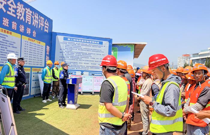 • 4月11日上午,五華區(qū)金鼎數(shù)字產(chǎn)業(yè)園(一期)項(xiàng)目聯(lián)合虹山派出所、黃土坡社區(qū)開展“普法強(qiáng)基”進(jìn)項(xiàng)目活動(dòng),項(xiàng)目部管理人員及所有工人共計(jì)80余人參加。活動(dòng)中,虹山派出所所長郭強(qiáng)結(jié)合真實(shí)案例,耐心細(xì)致地向工人們講解了防范電信網(wǎng)絡(luò)詐騙、賭博、吸毒、道路交通安全、農(nóng)民工實(shí)名制等方面的法律法規(guī),引導(dǎo)工人提高自身法律意識(shí)和安全防范意識(shí),遠(yuǎn)離不法行為和違法犯罪活動(dòng)。副所長陸永鋒運(yùn)用通俗易懂的語言對電信網(wǎng)絡(luò)詐騙的作案…